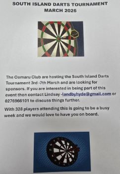 DARTS: We have the Clubs NZ South Island Darts tournament starting in March with approx. 320 players attending. The section is asking for expression of interest in sponsorship for the weeklong tournament. If this is something you are wanting to be part of, please contact Lindsay from the Darts Section - this is always a great tournament with some very talented players on show and of course a very busy week for our Club.
